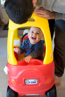 He also says "ball" now. He's always saying "ball, ball, ball" and pointing, and sure enough I'll look around and there will be a ball: the giant red balls outside of target, baseball pinatas in hobby lobby, kids playing ball in the park. He can spot them from a mile away. What's funny is when he finds something that isn't quite a ball. I fed him eggs the other morning for breakfast, and when he had finished what he was eating, he pointed to the other egg and said "ball". This particular evening he decided that the potatoes under the kitchen cart were balls. I told him it was a stretch...although, he does know that a football is a ball, and it isn't round...